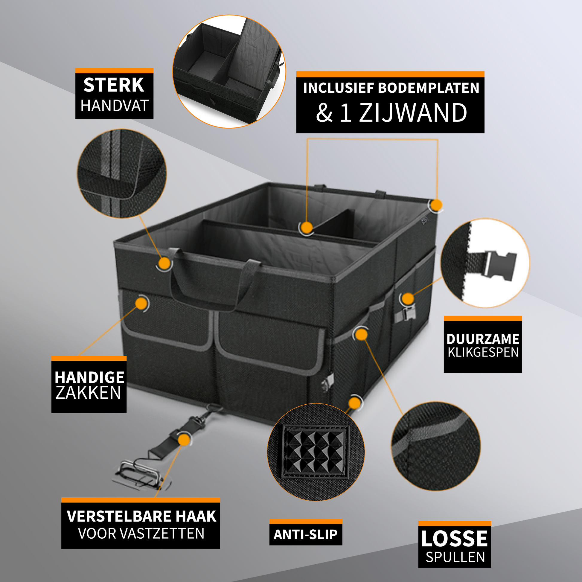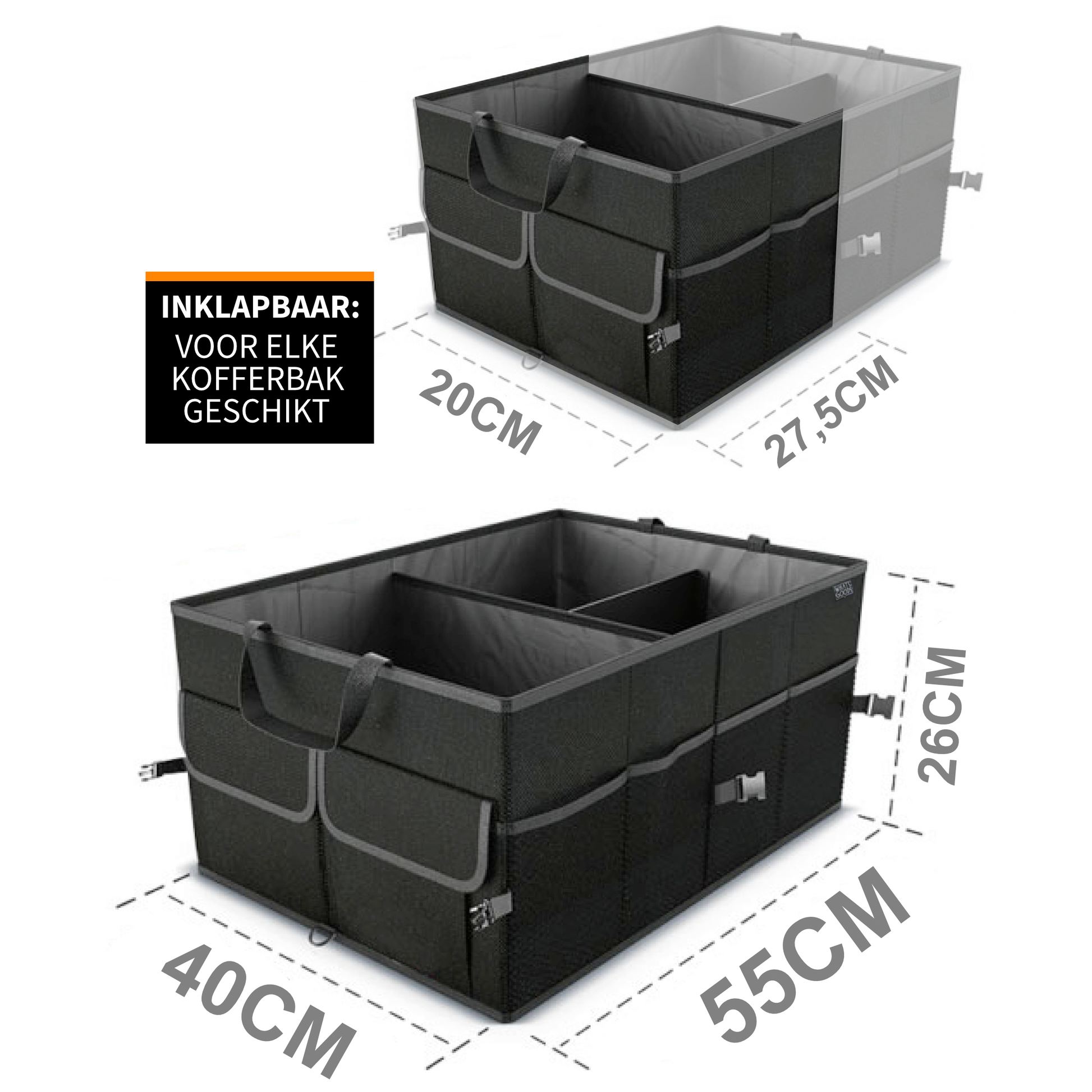 Buiten al deze geweldige voordelen krijgt u ook nog een auto-prullenbak gratis meegeleverd, voor al het vuil dat zich opstapelt in ieders auto. De organizer heeft een afmeting (volledig uitgeklapt) van 40x55x26cm (lxbxh).